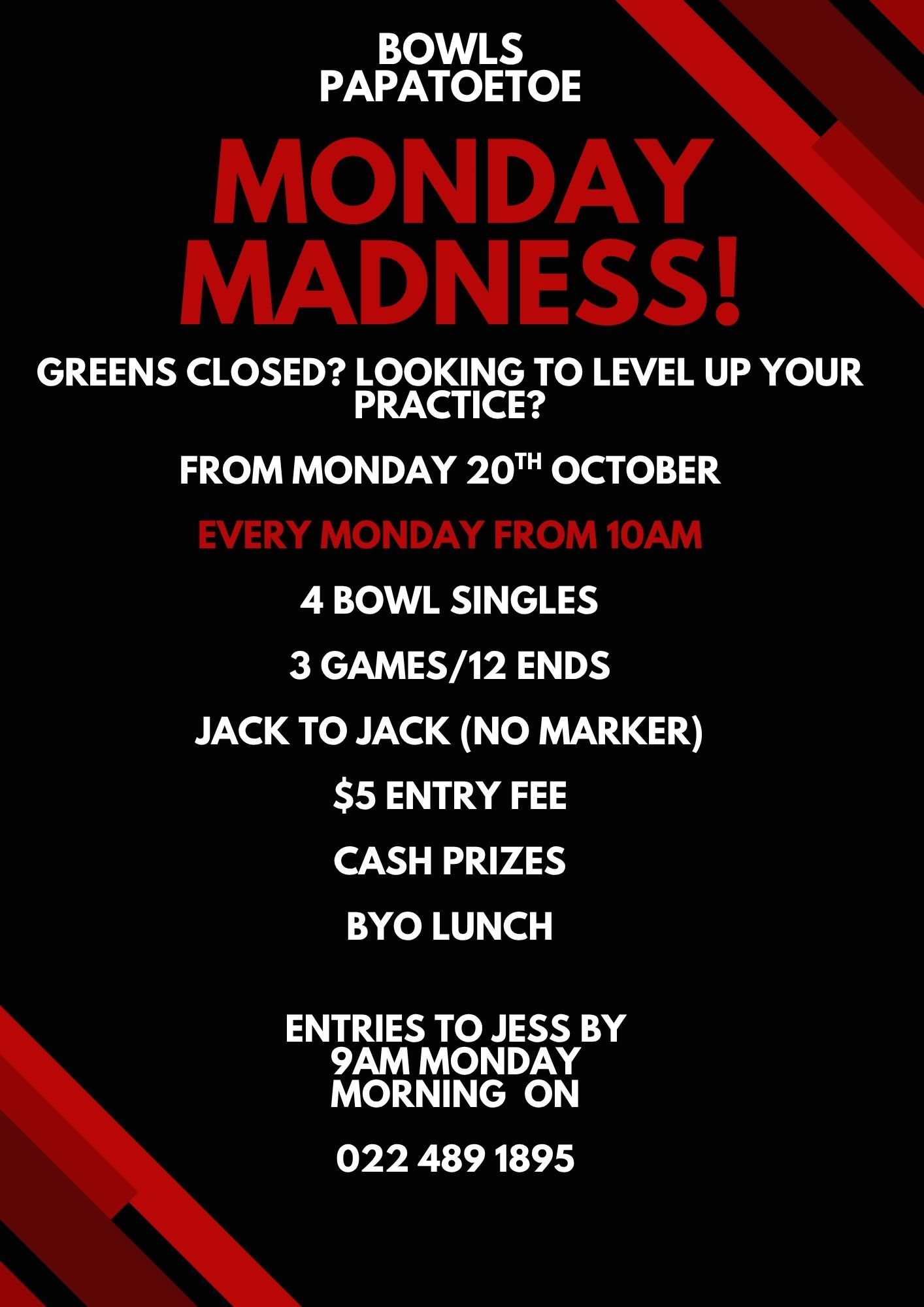 18 teams only. Entry by sign up sheet in the clubroom, online entry, or phone 09 537 5331. Entries close at 12pm on Tuesday. |